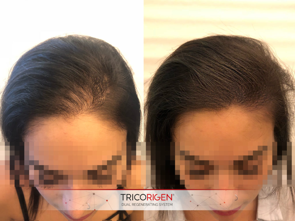 Le protocole Tricorigen combine la stimulation mécanique du cuir chevelu (par microneedling capillaire) et l’application de sérums biostimulants hautement concentrés.